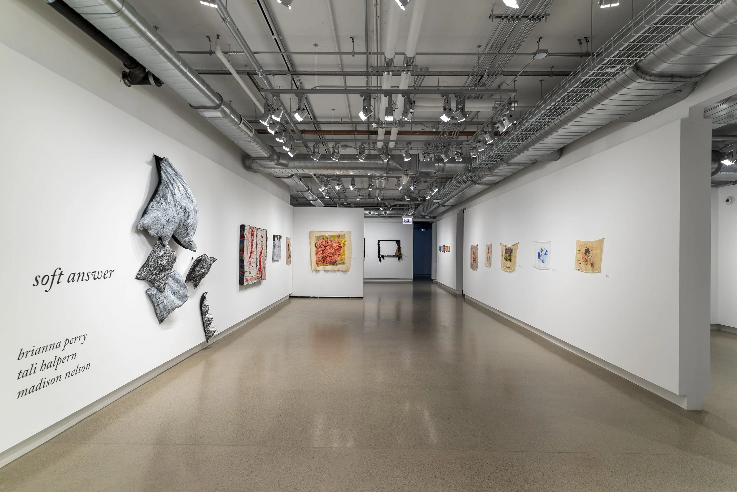 soft answer brings together recent work from Tali Halpern, Madison Nelson, and Brianna Perry, who all critically investigate the intersection of fiber and painting. Saturation and self-fashioning are critical to the artists’ construction (and deconstruction) of the picture plane, with each artist employing stylized and distorted colors to communicate their subjectivities. Depictions of memory, personal narratives, and familial histories acknowledge the past as always in transformation. Through traditional textile and surface design processes, including weaving, quilting, dyeing, and screen printing, the artists translate digital and analog imagery, repurposing the traditionally white masculine history of painting to their ends.